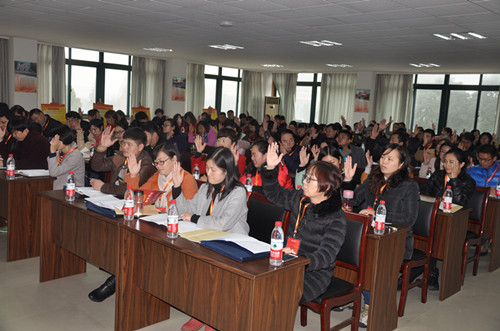 下午一点多,伴随着激昂的音乐,代表们一一进入会场。两点会议正式开始,王其军首先代表会议筹备组对参加本次会议的代表表示了欢迎,并对本次会议的筹备情况作了说明。经过前期投票选举,应参加本次大会的正式代表共有103人,出席本次预备会议的正式代表97人,因病、因事请假6人,实际到会代表人数超过半数,符合规定,可以开会。本次会议的主要议题有:通过大会主席团建议名单;通过大会秘书组建议名单;通过大会资格审查组建议名单;通过大会议程。在举手表决过程中,代表们一致同意本次代表大会的主席团建议人选、秘书组建议人选、资格审查组建议人选和大会会议议程。