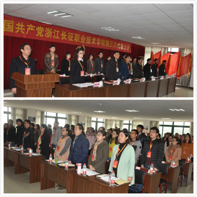 学院党员之家布置一新,气氛庄严、热烈,主席台上10面鲜艳的红旗分列两侧,簇拥着镰刀和锤头组成的中国共产党党徽,上方悬挂着中国共产党浙江长征职业技术学院第三次代表大会红色横幅。上午8时30分,大会在雄壮的国歌声中开幕。