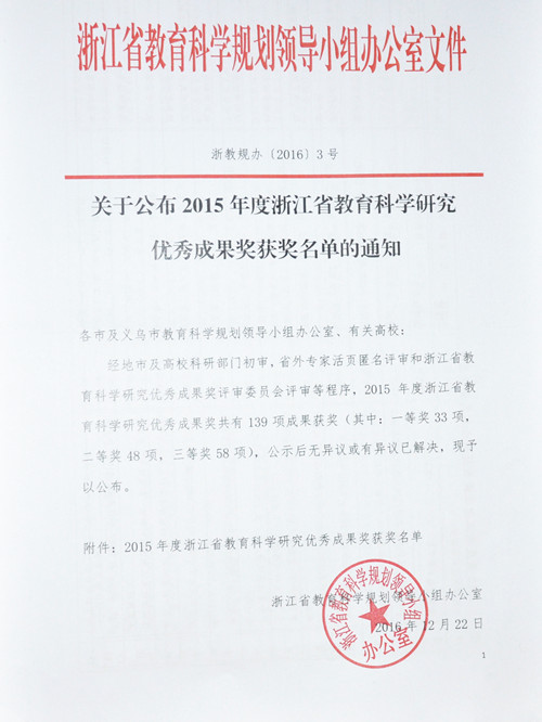 我院张晓燕等老师获2015年度浙江省教育科学研究优秀成果奖
