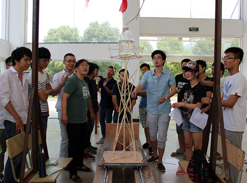 比赛分为两个环节,首先是称量模型的重量,再到测试模型在承重情况下的坚固性能。比赛的测试坚固性能是最扣人心弦的环节。第一个参赛模型因根基不稳而倒塌。这让很多参赛队员心里忐忑不安了,同时也带来了压力。接下来的测固过程中,每个团队都拿出自己的建筑模型。有的模型过于单薄,在水桶放上去的时候就承受不住压力而倒塌。也有的侧重于模型根基,导致上部不稳而破坏。可以看出这一定程度上提高了比赛难度。比赛中最厉害的一个模型成功的承受了重量和震动仪的晃动。在几次实验中模型都不曾损坏,同学们惊叹之余给予了热烈的掌声与欢呼。赛后,陈老师也耐心的给参赛团队讲解失败之处,为同学们点迷津,解疑惑,树信心。