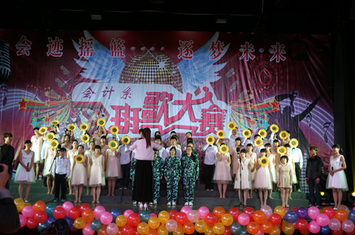 班歌大赛由13级会计系19个班级组成的,19支代表队分别以别出心裁的服装、高亢嘹亮的嗓音华丽亮相。《没有共产党就没有新中国》,让我们深深的体会到了以前抗战时期的艰辛不易,《爱,因为在心中》教会我们如何耕耘、享受收获,永远与快乐同行,在我们这个年纪谁没有犯错过,但是我们不要气馁,只因为《明天会更好》。经过激烈角逐,最终13会计15班以扎实整齐地合唱、别具匠心的编排成功夺魁,13会计4班和13会计13班分别列二三名。至此,会计系第一届“会迹摇篮,逐梦未来”圆满落幕。