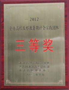 2012年暑期,为不断推进高校反邪教工作的深入和开展,培养学生的创新精神和社会实践能力,省教育厅宣教处、共青团浙江省委学校部和省反邪教协会联合举办了2012年反邪教暑期社会实践活动。我院反邪教协会积极响应号召,在院团委老师指导下,组织了暑期反邪教社会实践团队,积极深入群众当中,认真完成了本次实践活动,获得了社会各界一致好评,被浙江省反邪教协会评为2012年度全省高校反邪教暑期社会实践团队三等奖。