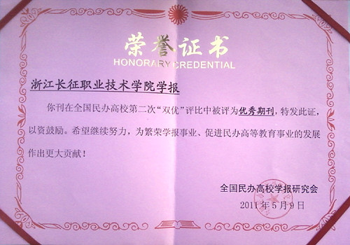 浙江长征职业技术学院学报自2009年9月创刊以来,坚持党中央正确舆论导向,在执行院长吕振合教授(主编)领导下,编辑部员工严格办好学报。在2011年5月全国民办高校第二次“双优”评比中获得优秀期刊称号,张伟东《用工制度影响教职员工组织承诺的实证研究》获得优秀论文二等奖。