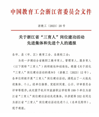 近日,中国教育工会浙江省委员会发布《关于浙江省“三育人”岗位建功活动先进集体和先进个人的通报》,我校商务与贸易学院被授予浙江省“三育人”岗位建功活动先进集体荣誉称号,管理学院潘雅辉老师被授予浙江省“三育人”岗位建功活动先进个人荣誉称号。