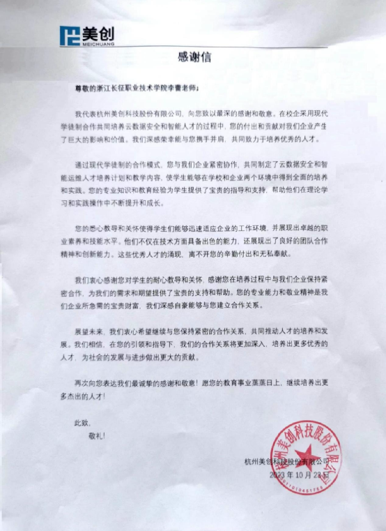 美创科技成立于2005年,是浙江省双软认证企业、国家高新技术企业、省级企业研究院,是通过国家信息安全产品CCC级的上市公司。近年来,为打造企业核心竞争力,公司大力加强人才梯队建设,不断健全完善员工培训体系、晋升体系和薪酬体系,并与我校合作成立了美创现代学徒制班,为学校学生的职业发展提供科学指导和有力帮助。美创科技在信中强调,合作5年多来,学校通过现代学徒制的培养模式,成功为企业输送了一批批具备深厚的专业知识、丰富的实践经验和出色的团队协作能力的高素质云数据安全与智能运维人才,为美创科技的业务发展注入了新的活力,缓解了公司用人之需。