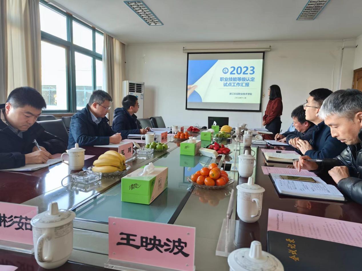 近日,浙江省技能人才评价管理服务中心副主任吴天、科长陈彬斌、王玮一行来我校考察2023年职业技能等级认定试点(电工、汽车维修工)工作开展情况。会议由副校长冯新红主持,智能技术学院副院长张晓燕、相关部门负责人参会。