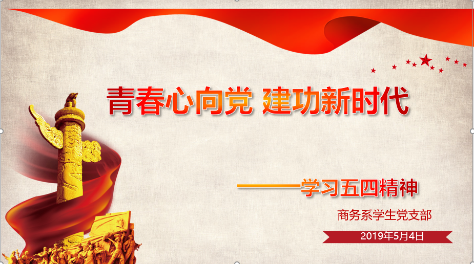 五四青年节源于中国1919年反帝爱国的“五四运动”,五四爱国运动是一次彻底的反对帝国主义和封建主义的爱国运动,也是中国新民主主义革命的开始。今年是五四运动100周年,也是中华人民共和国成立第70周年。在这100年中,中华大地经历了多少风风雨雨,历经了多少艰难险阻,又有多少革命前辈的艰苦奋斗,才有了今天我们强大的祖国与幸福的生活。在4月30日举行的纪念五四运动100周年大会上,习近平总书记对新时代中国青年提出了殷切期望。他说:今天,新时代中国青年处在中华民族发展的最好时期,既面临着难得的建功立业的人生际遇,也面临着“天将降大任于斯人”的时代使命。新时代中国青年要继续发扬五四精神,以实现中华民族伟大复兴为己任,不辜负党的期望、人民期待、民族重托,不辜负我们这个伟大时代。