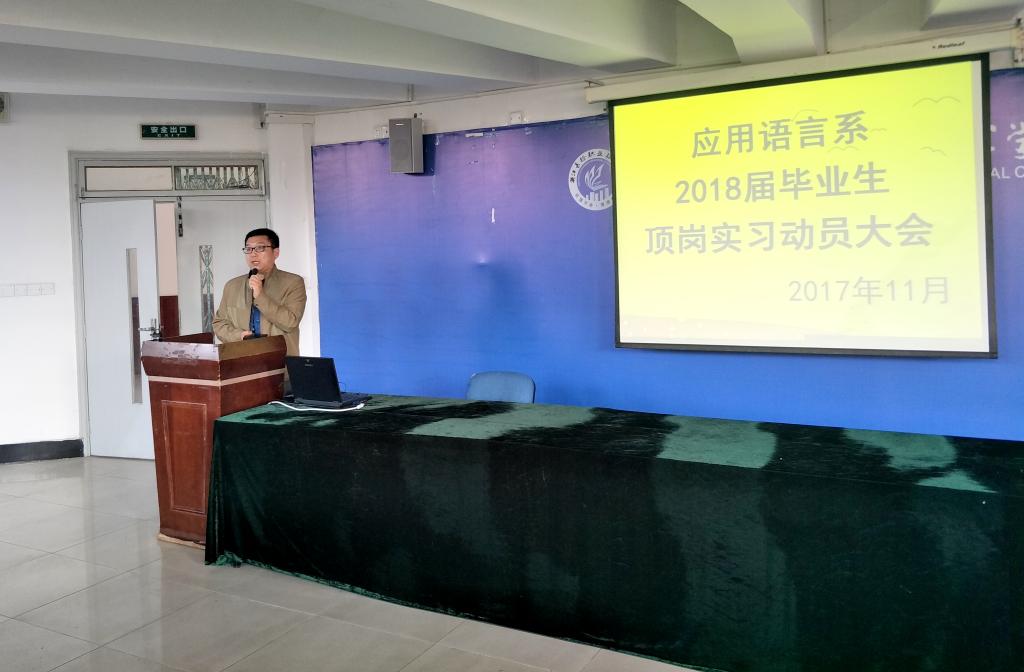 为了进一步完善2018届毕业生顶岗实习和就业工作,引导学生做好顶岗实习的心理准备,应用语言系于11月9日下午在1117教室举行2018届毕业生顶岗实习动员大会。各毕业班班主任、辅导员和全体同学参加了会议。