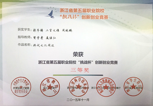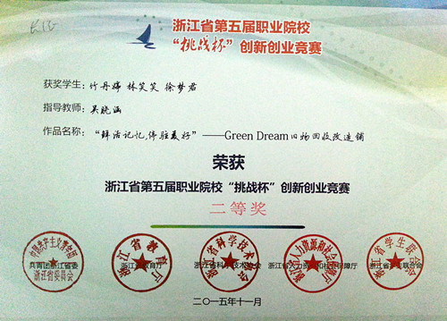 浙江省第五届职业院校“挑战杯”创新创业竞赛于2015年6月启动,经校赛选拔,我院有7个项目参加省赛,在决赛环节中经过集中答辩、公开答辩,我院参赛项目竹丹婷、林笑笑、徐梦君三位同学的作品《“鲜活记忆,停驻美好”——Green Dream旧物回收改造铺》(指导老师吴晓涵)荣获浙江省第五届职业院校“挑战杯”创新创业竞赛二等奖,此外,戚梁良、周欢、蒋欣宏、蔡玛霖、潘旭云五位同学的作品《“青春会计”学生服务平台创业计划书》(指导老师李慧刚、王立研、王斐)和彭李铸、上官文雅、周瑞鹏三位同学的作品《游戏文化周边》(指导老师贺学贵、姜继红)荣获浙江省第五届职业院校“挑战杯”创新创业竞赛三等奖。