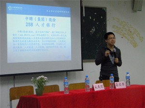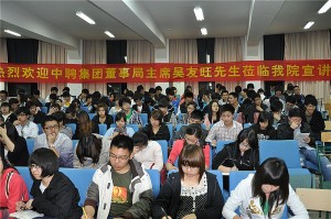 首先,由中聘(集团)股份销售总监助理王少华先生详细介绍了其公司的发展历程和取得的荣耀。随后,讲座在一个简短的暖身游戏中拉开帷幕。讲座以互动的形式进行同学们都积极参与,围绕大学生就业难、怎样找一份好工作、大学生如何创业等当下热门的话题进行了提问。吴友旺先生用自己的亲身经历和生动幽默的语言一一为同学们做解答,并鼓励同学们珍惜时光,多读书,多学习,将勤补拙。同学们认真听取了吴友旺先生的解答后深受启发,纷纷表示要刻苦学习好专业理论知识和锻炼实践动手能力,为今后走上社会多积淀一些资本。
