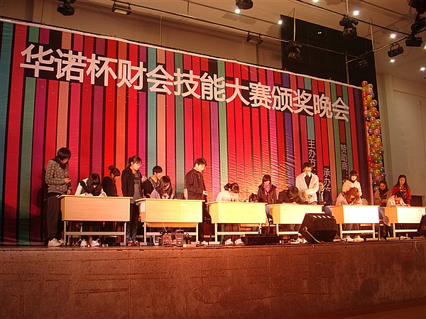 2010年12月1日晚6:30在校体育馆隆重举行本届“华诺杯”财会技能大赛决赛与颁奖典礼。出席本次晚会的领导有副院长杜宝山、党委副书记洪骏、副院长贺旭辉、华诺公司的董事长杨东旭、学院财会学院院长高晓红,各系部、各部门领导,以及财务与会计学院的老师与同学。