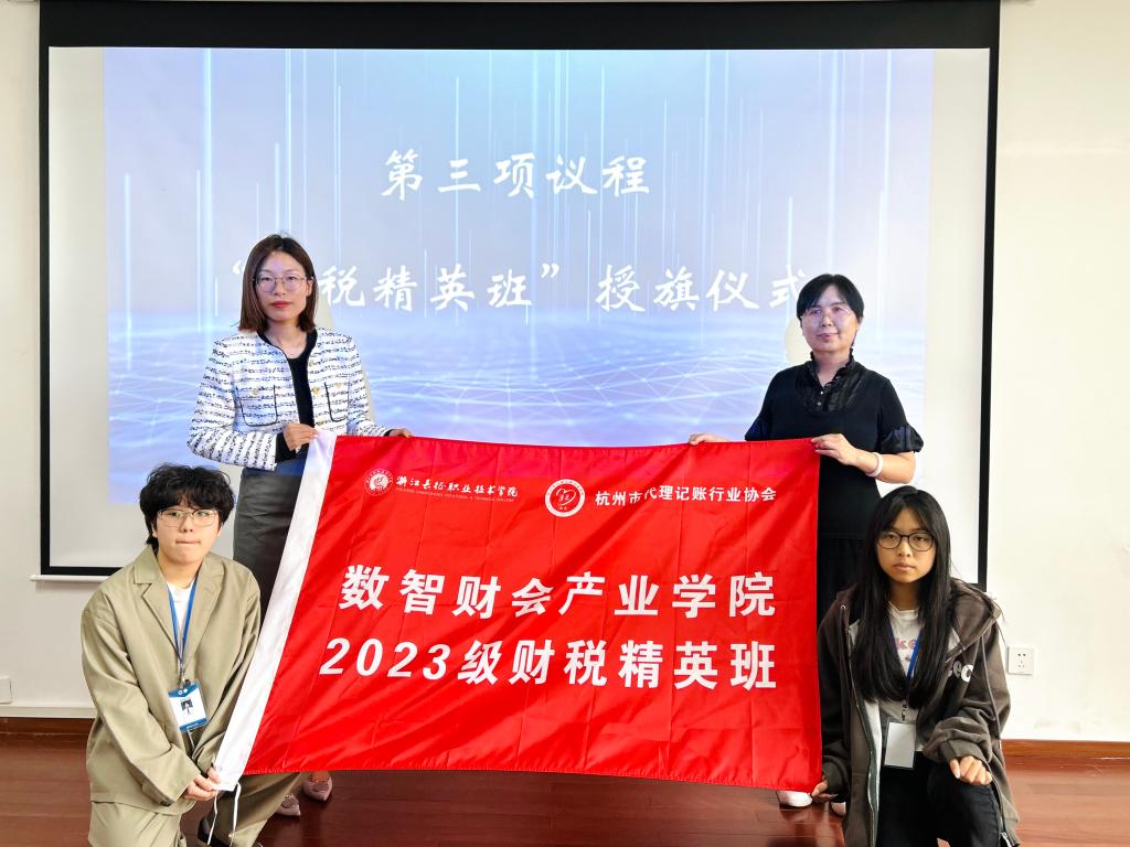 杭州市代理记账行业协会执行会长洪静、财务与会计学院党总支书记杨军为“财税精英班”学生代表授旗。