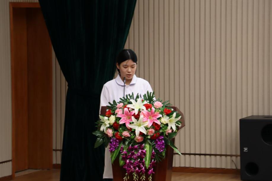 朱芝杉同学围绕夯实基础知识、端正思想态度和勇于把握机会等方面向同学们分享自己的心得体会。她表示,要在提高自身能力的同时摆正好态度,不断学习、不断努力,实现从一名护生到护士的角色转变,勇敢地争取机会、展现自己。