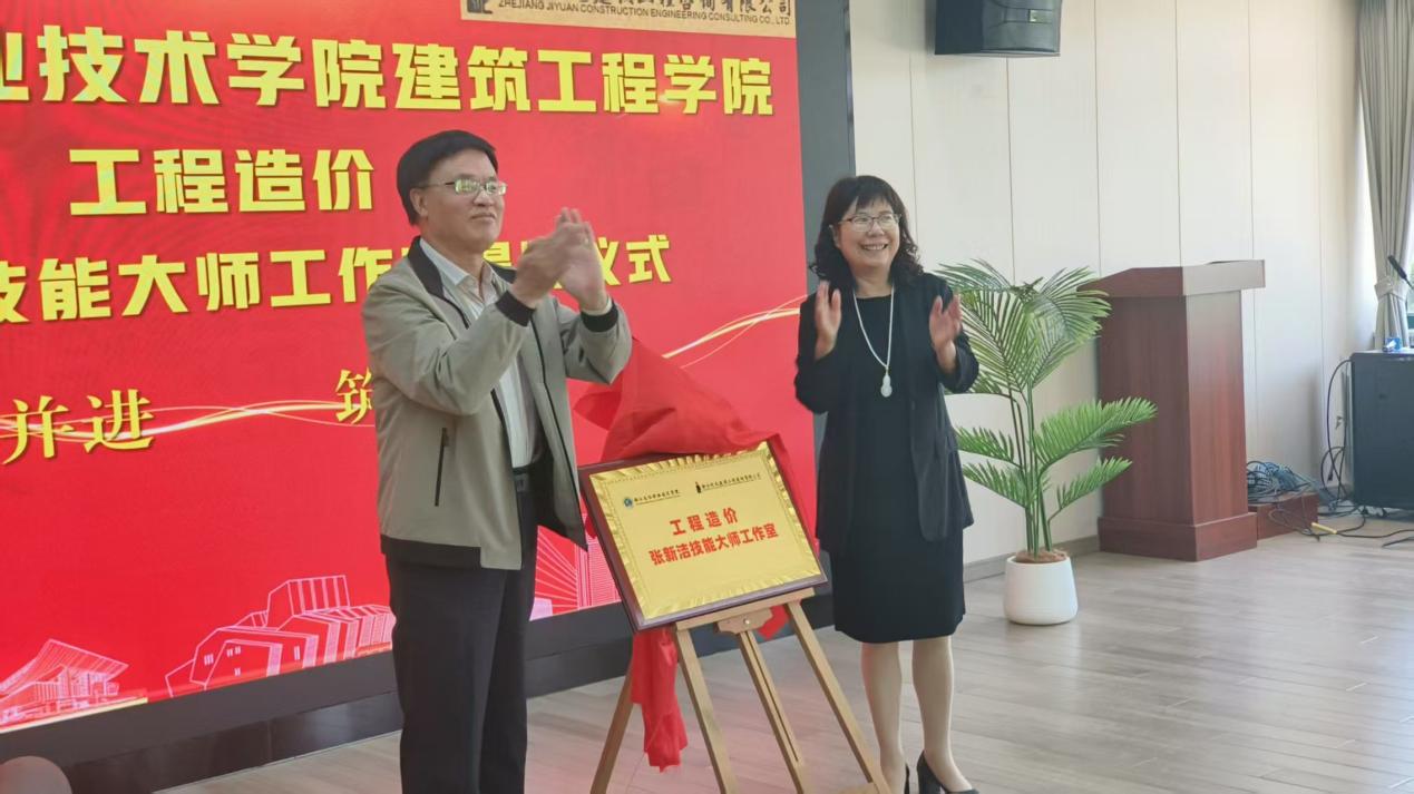 建筑工程学院副院长杨琼为本次仪式致辞。她表示,技能人才是连接技术创新与生产实践最核心最基础的关键要素,希望“张新洁技能大师工作室“在今后的工作中,充分发扬工匠精神,对学生作为浙江纪元建设工程咨询有限公司总经理,张新洁在讲话中表达了企业对工作室建设的大力支持与发展期望。随后,高创宽和张新洁共同为技能大师工作室揭牌。