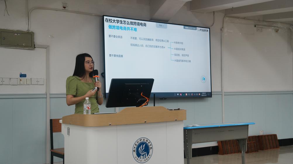 沈谊宇为同学们做新媒体创业主题分享。她围绕新媒体营销发展趋势、大学生创业优势挖掘、跨境电商海外社媒营销实战技巧、AI工具赋能运营策略优化以及自媒体流量如何变现等核心内容展开分享,结合大量案例分析,提供实操指导,为同学们带来了满满干货。