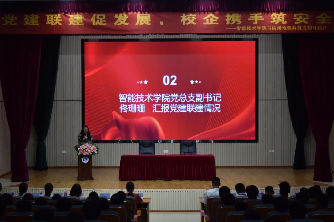 近日,智能技术学院党总支与杭州地铁运营有限公司客运二公司客运部站务三中心第五党支部校企党建联建签约暨“杭铁智院服务队”授旗仪式在学院第二报告厅隆重举行。杭州地铁运营有限公司客运二公司党委委员、副总经理施力强,客运部部长倪松洋,站务三中心第五党支部书记孟智威,智能技术学院教师支部书记、学院院长张晓燕、党总支副书记佟珊珊出席仪式。