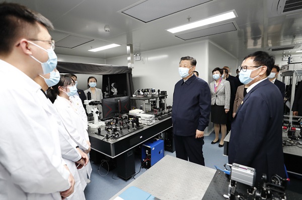 清华大学主楼二层,展示了学校近年来重点教学科研成果。习近平听取了关于增强自主创新能力、助力世界主要科学中心和创新高地建设、提高人文社会学科教育研究水平等情况介绍,对清华大学取得的成绩给予充分肯定。习近平指出,要坚持中国特色社会主义教育发展道路,充分发挥科研优势,增强学科设置的针对性,加强基础研究,加大自主创新力度,并从我国改革发展实践中提出新观点、构建新理论,努力构建中国特色、中国风格、中国气派的学科体系、学术体系、话语体系。